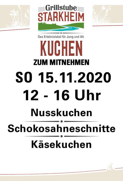 Unsere Hausgemachten Kuchen am SO 15.11.202012 - 16 Uhr im StraßenverkaufNusskuchenSchokosahneschnitteKäsekuchenPS: Es gibt auch Kaffee ToGO