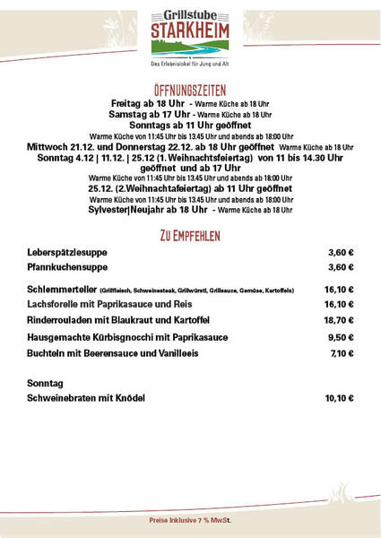 Mittwoch 21.12. und Donnerstag 22.12. ab 18 Uhr geöffnet Warme Küche ab 18 Uhr