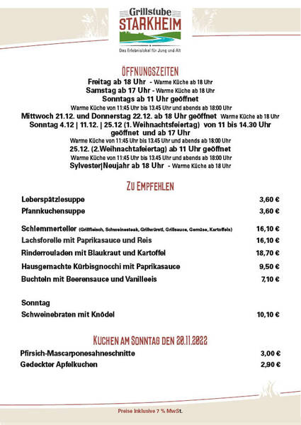 Mittwoch 21.12. und Donnerstag 22.12. ab 18 Uhr geöffnet Warme Küche ab 18 Uhr