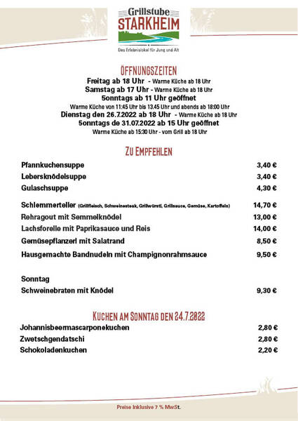 Preise im „Außer Hausverkauf“ Inklusive 7 % MwSt.