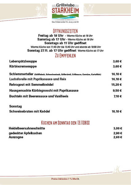 Sonntag 27.11. ab 17 Uhr geöffnet Warme Küche ab 17 Uhr