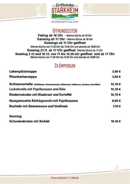 Sonntag 27.11. ab 17 Uhr geöffnet Warme Küche ab 17 Uhr