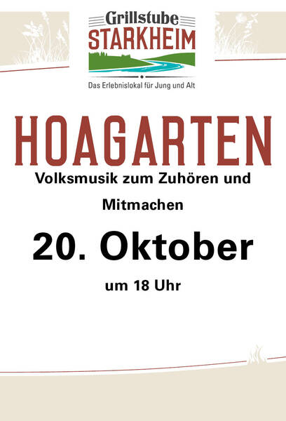 Am Donnerstag, den 30. Juni 2022, um 18.00 Uhr findet in der Grillstube Starkheim bei Mühldorf ein traditioneller Volksmusik-Hoagart statt.