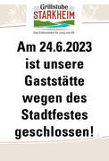 Am 24.6.2023 ist unsere Gaststätte wegen des Stadtfestes geschlossen